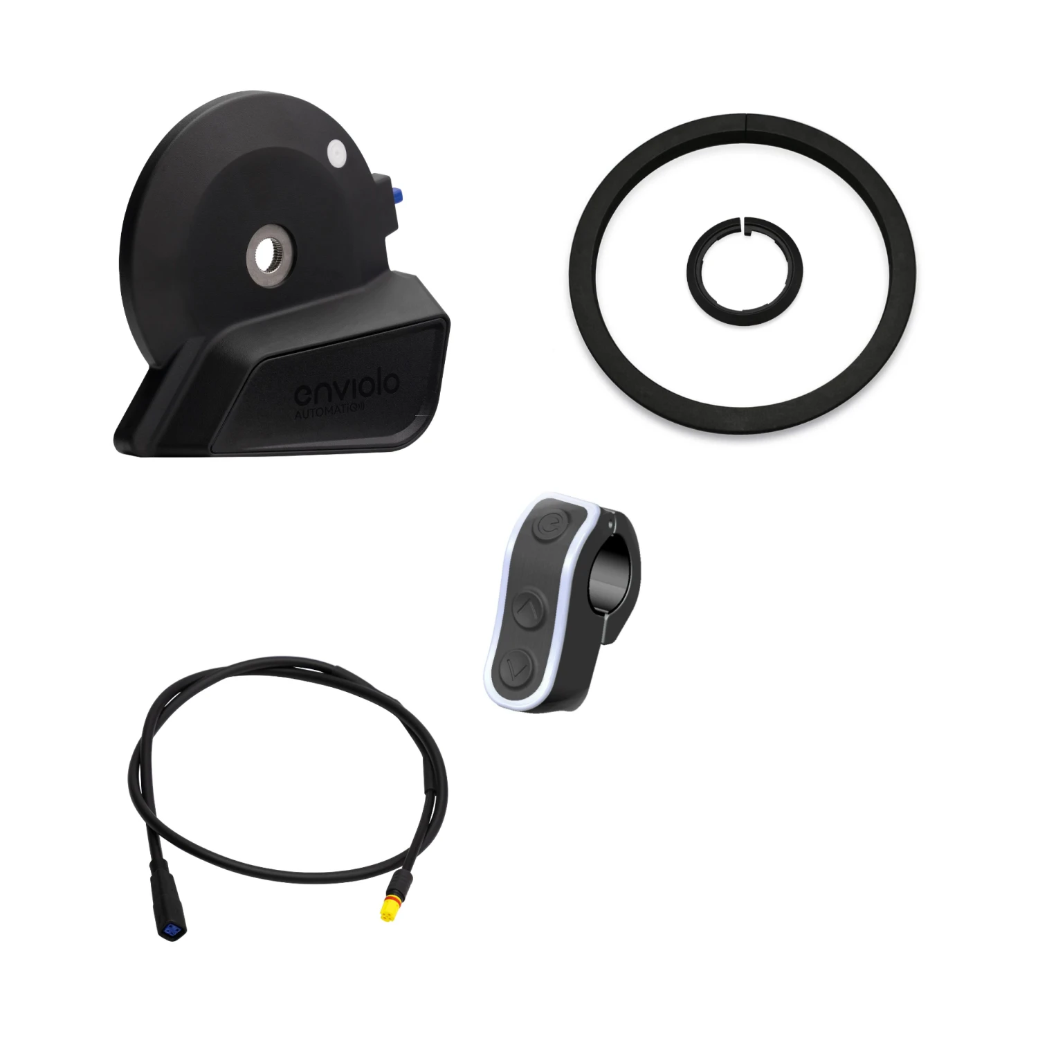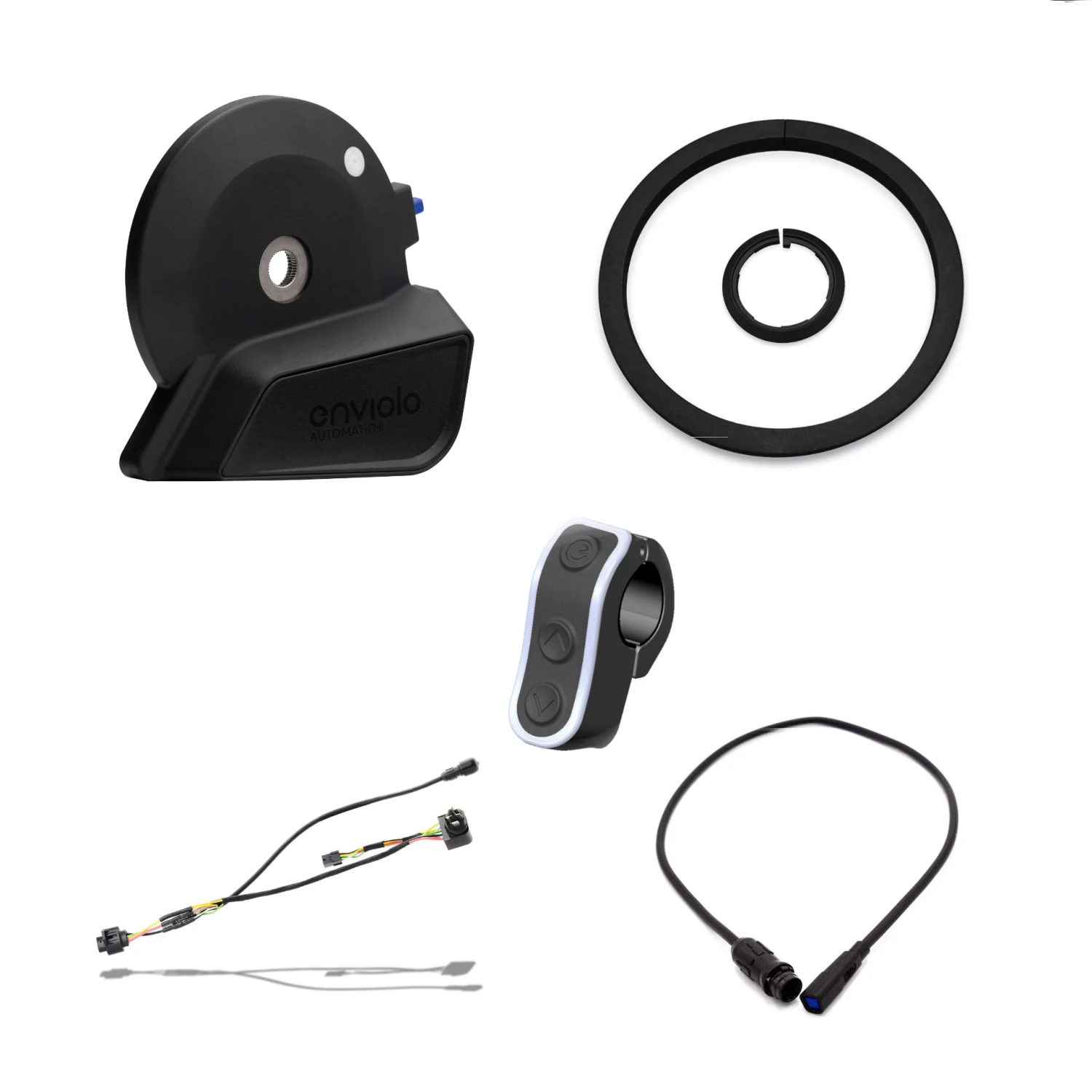 | Scope of delivery: | 1x Enviolo AUTOMATiQ switching interface, 1x Enviolo AUTOMATiQ Cliq Pro control unit, 1x large magnetic ring, 1x small magnetic ring + matching motor connection cables |